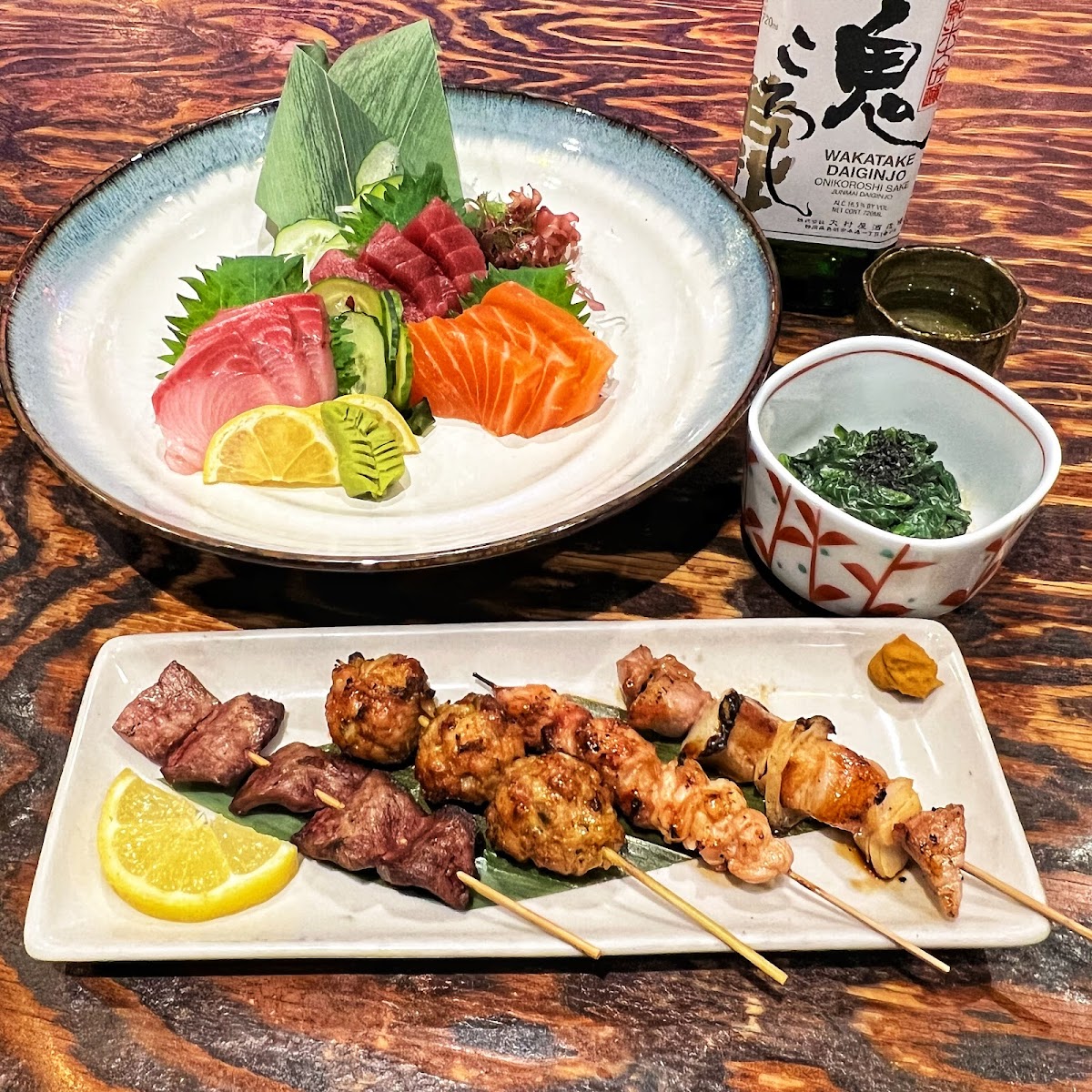 Food: - Buta kakuni- my daughter LOVED this - Sashimi - 3 kinds. This was very fresh , probably the best dish we ordered. - grilled onigiri. This is ok. Nothing is inside. - grilled miso cod. Very good. - salmon ochazuke. Bland. Pass. - agedashi tofu. Just ok. The batter seemed wrong. - grilled mushroom. So surprisingly delicious. The sauce was yum. Get this. - grilled chicken ball. Dry. Pass - grilled chicken wing, chicken with pork. Just ok I wish they would make a sashimi salad and add vegetable tempura to the menu. Service: this girl could not smile to save her life. Devoid of any personality. Ambiance: several tables, bar seating and Japanese style seating with your feet dangling down the hole. Tip: make reservations.